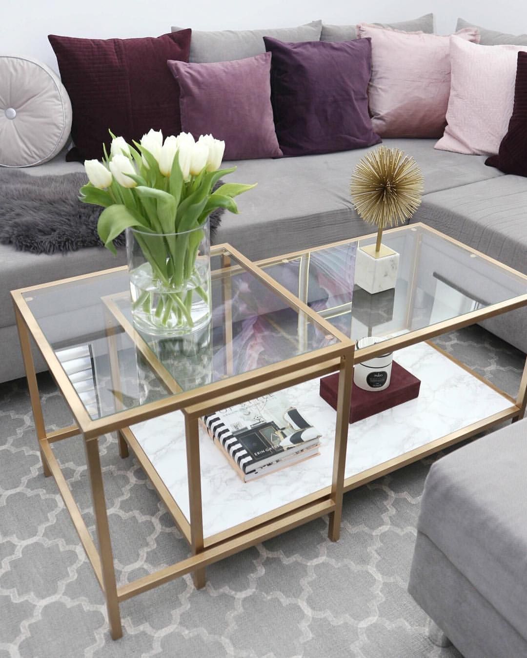 2 nested coffee tables made of steel with gold electrostatic coating , clear glass and Karrara marble